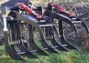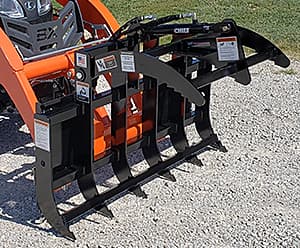 Designed for compact tractors up to 50 engine horsepower that are equipped with a front loader, this 60" wide utility grapple allows the acreage owner unsurpassed versatility in clearing brush, piling limbs or orchard maintenance. The root rake with 34” wide single upper grapple is equipped with 3000 psi cylinder and is great for clearing fence rows. The replaceable wear points allow the operator to get under debris, picking it up while leaving the dirt behind. This brush grapple is sized to work with a compact tractor, allowing the large property owner to get more done in a day’s time.