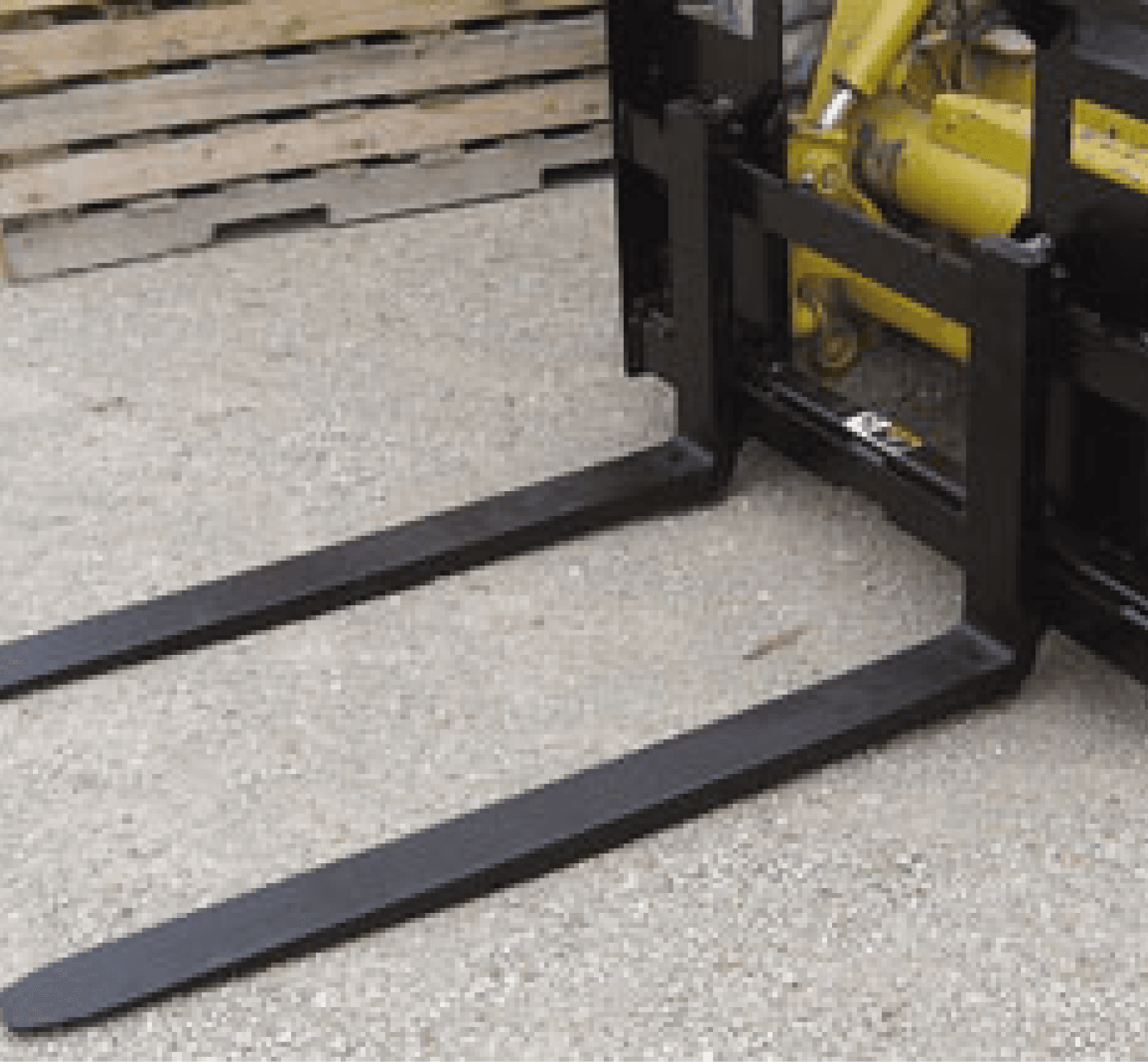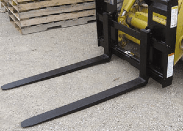 - Skid steer pallet forks (4,000 lbs. or 5,500 lbs.) are offered with a one piece backstop or a step through design for easy cab access and excellent visibility.