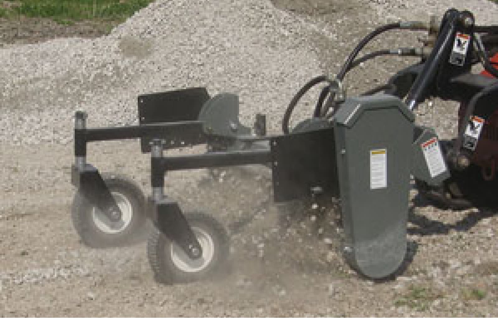 Elevating productivity, the 10-Series Power Rakes for Mini / Compact Skid Steers features a #80 chain drive, flip-up side shields, dual gauge wheels, adjustable material bar and optional hydraulic angle.