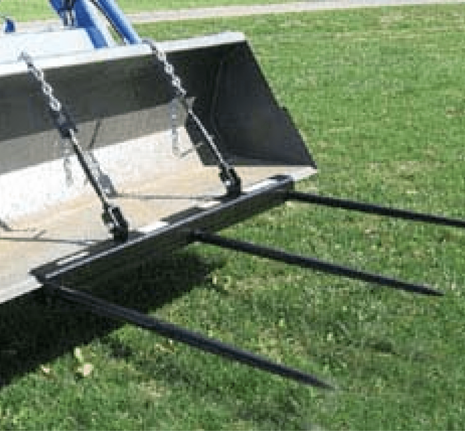 Quickly convert your front loader bucket into a tool for handling large round bales. Each spear mounts over the bucket cutting edge with heavy angle iron for support and utilizes the bucket underside for leverage.