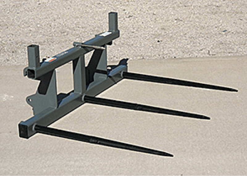 Triple bolt-in forged spears spaced 26" apart, with usable length of 26". For handling single or double (with optional uprights #831095) large-size square bales. Rated at 3,000 lbs. Item #832365, 175 lbs.