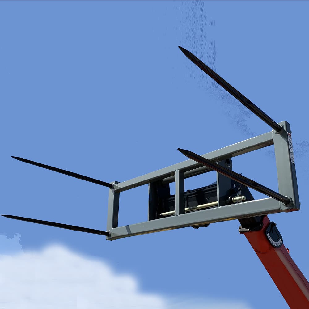 Dual bolt-in forged spears spaced 34” apart, with useable length of 42”. For Telehandlers & Wheel Loaders with Skid Steer Mount Rated at 3,800 lbs. For round bales. Item # 833425, weight 147 lbs.