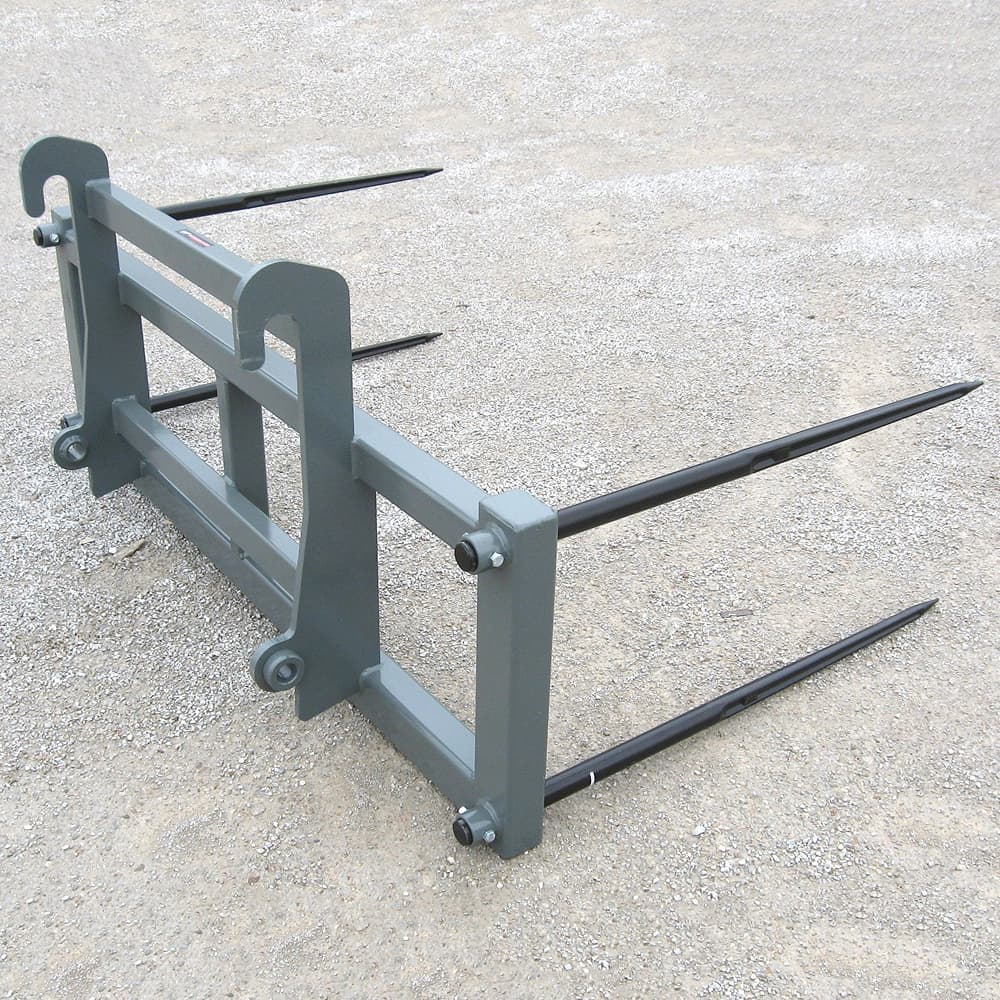 Triple bolt-in forged spears spaced 26” apart, useable length of 42”. Fits Manitou Rated at 4,000 lbs. For large square bales. Item # 833430, weight 235 lbs.